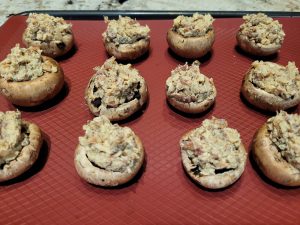- Place the mushroom caps on the baking tray and, using a spoon, fill the caps. They will be piled high.